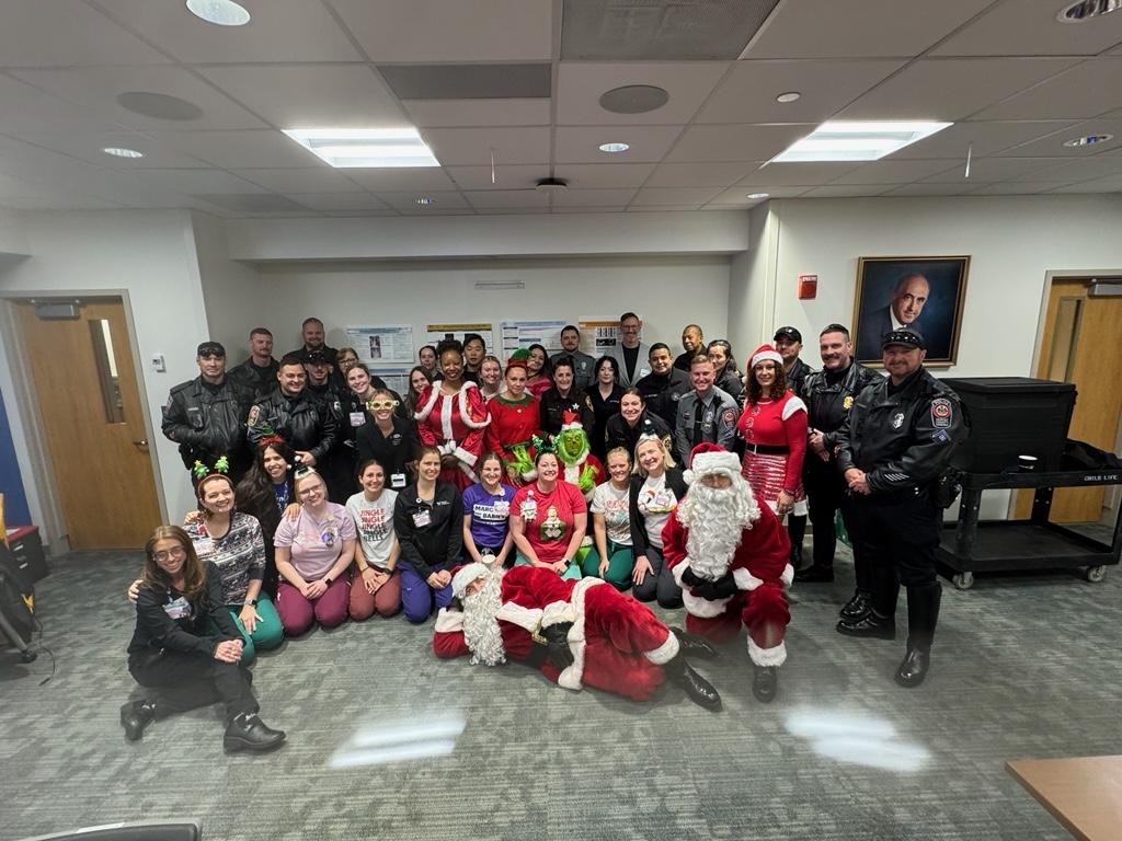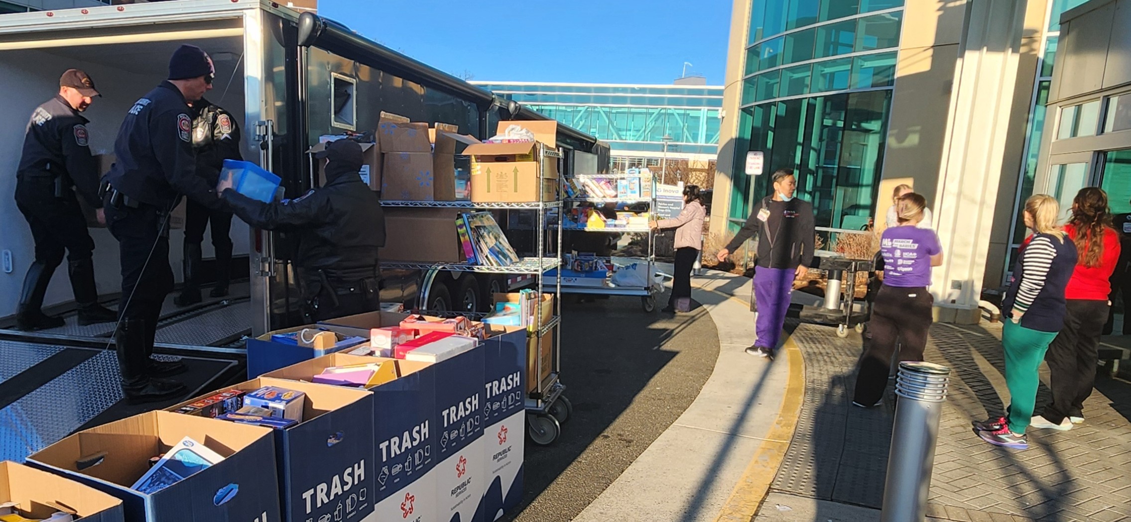 In early December, we hand off all of the donated gifts to the Fairfax County Police Motor Squad and local nonprofits – in dramatic fashion! And we then join the Motor Squad at Inova Children’s Hospital to sort all the toys collected from across Fairfax County, and hand deliver them to children in the Hospital.